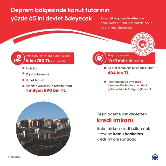 Çevre, Şehircilik ve İklim Değişikliği Bakanlığı'ndan yapılan açıklamalara göre, bütün afet konutlarının ödeme süreci 2 yıl sonra başlayacak. Konutlar, faizsiz olarak 18 yıl taksit imkanı ile sunulacak. Bu detaylar kapsamında, 3+1 olarak tasarlanan bir afet konutunun taksitli satış fiyatı 1 milyon 890 bin TL olacak ve aylık sabit taksit 8 bin 750 TL olarak belirlenmiştir.